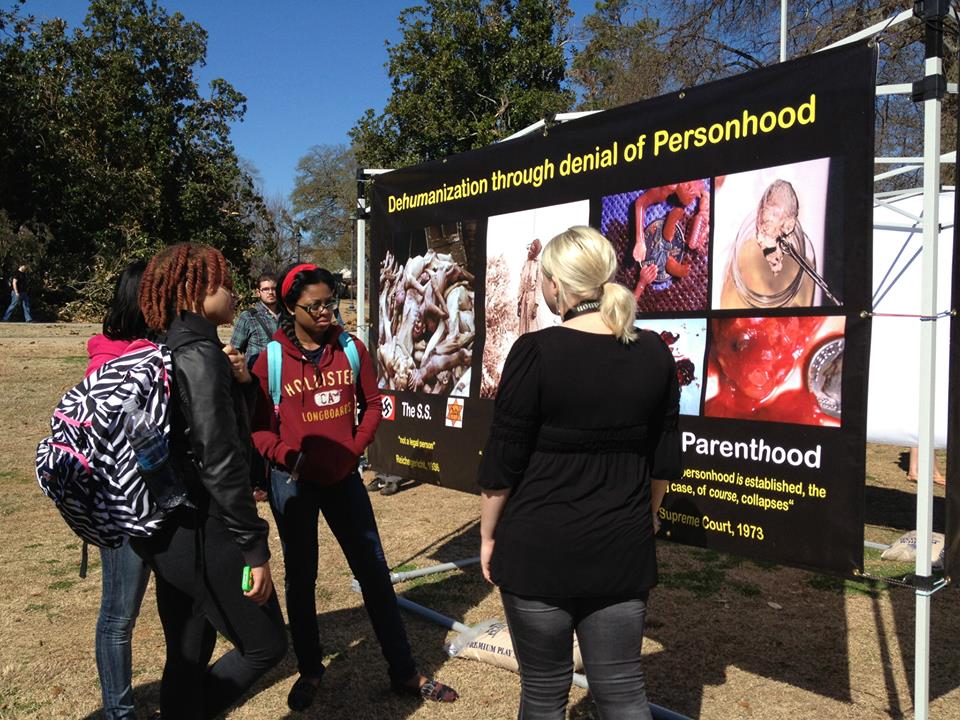 So, we walked over to our Pillars of Personhood display and walked through the stages of human development, asking at what time we are human versus at what time we are persons. He said that we’re human at conception, but not persons until we’re born. When I asked him what was different between our picture of a newborn and a 7 month old baby in the womb, he said, “I know they’re different, I just don’t know what it is.” I then explained that the only differences were size, level of development, environment, and degree of dependency, and that those things don’t really determine whether we’re a person. I showed him our graphic photo panel and asked why the black woman was hanging dead from a tree. He accurately recognized that it was her skin color that condemned her – simply because she looked different. We walked back to the fetal development panel and asked if he was denying personhood to a baby in the womb simply because it looks different than a newborn – like what had happened to the blacks, the Jews, the Native Americans, etc. He then changed his mind, right then and there, and said that personhood begins at the moment of fertilization.