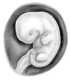 At this stage of development the head of the embryo is almost one half of his or her total size. Brain tissues grow rapidly, dividing and becoming a miniature brain that is distinctly human. By 40 days (the sixth week) brain waves can be recorded. Fingers and feet are beginning to develop. Milk teeth form at 61/2 weeks. Facial features, including ears, nose, lips and tongue, form with clarity during this month. Eyes form and darken when pigment is produced around day 35. Eyelids cover the eyes and will soon form a protective seal, reopening during the seventh month. Near the end of the month the skeleton changes from cartilage to bone. Forty muscle sets begin their first exercises and, working with the nervous system, respond with small movements to touch. The baby’s blood type is often different from his or her mother’s. By eight weeks all body systems are present, and from now on changes will be primarily in size and refinement of body parts already formed. The tiny baby at this stage is called a fetus, Latin for “offspring” or “young one.”